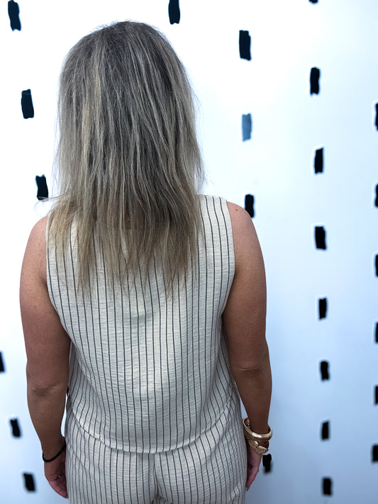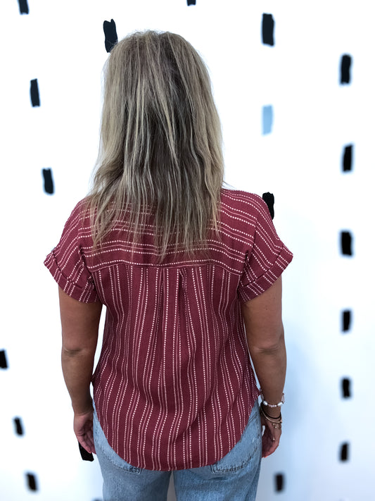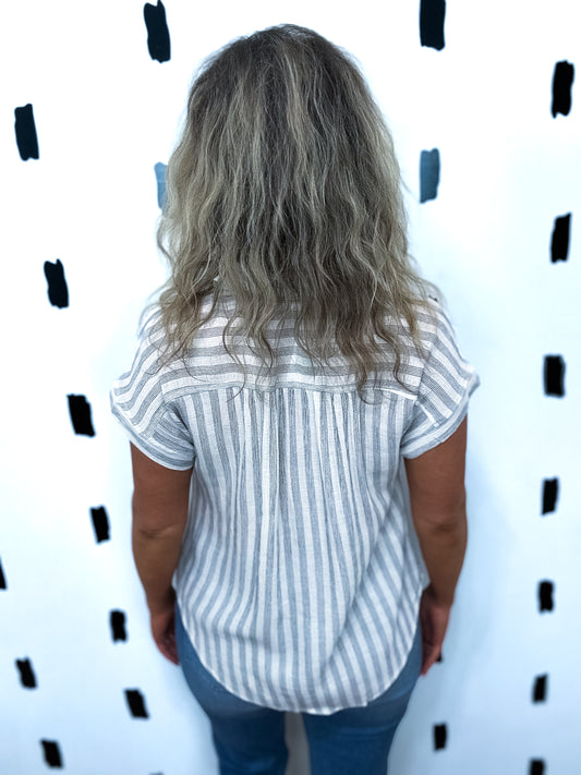 Black Stripe Collared Cuff Short Sleeve Blouse