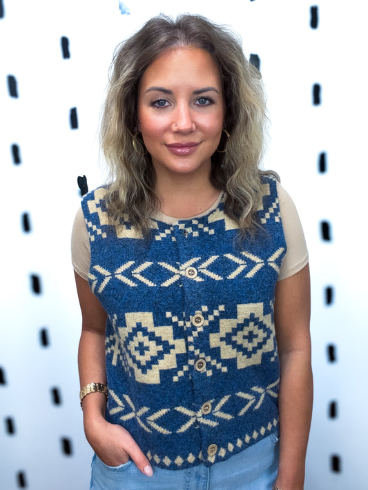 Blue Aztec Print Button Down Knit Vest