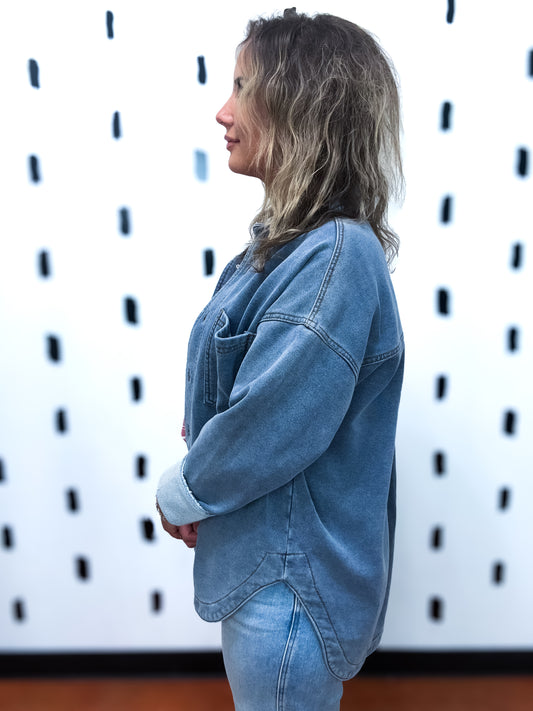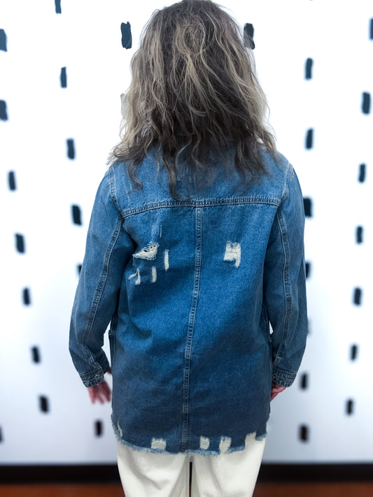 Med Wash Distressed Oversized Denim Jacket