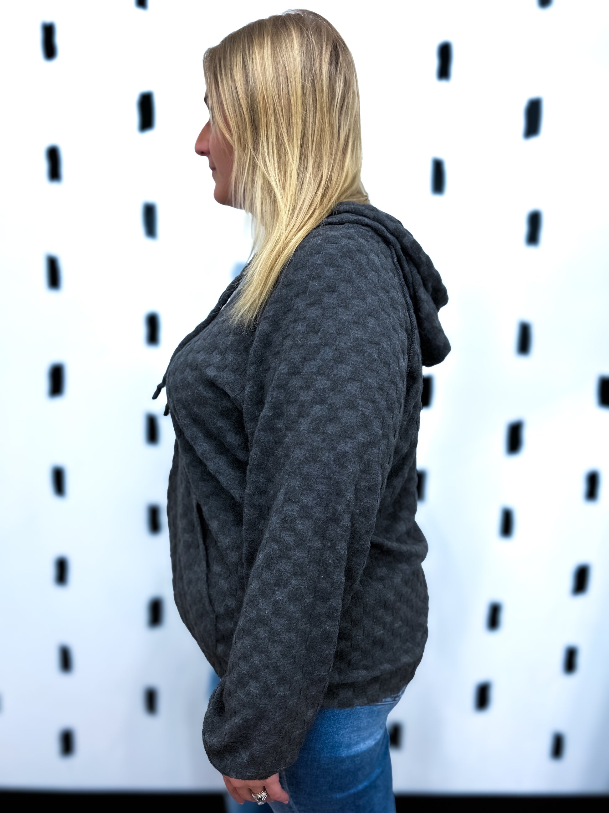 Black Checkered Knit Hoodie Top