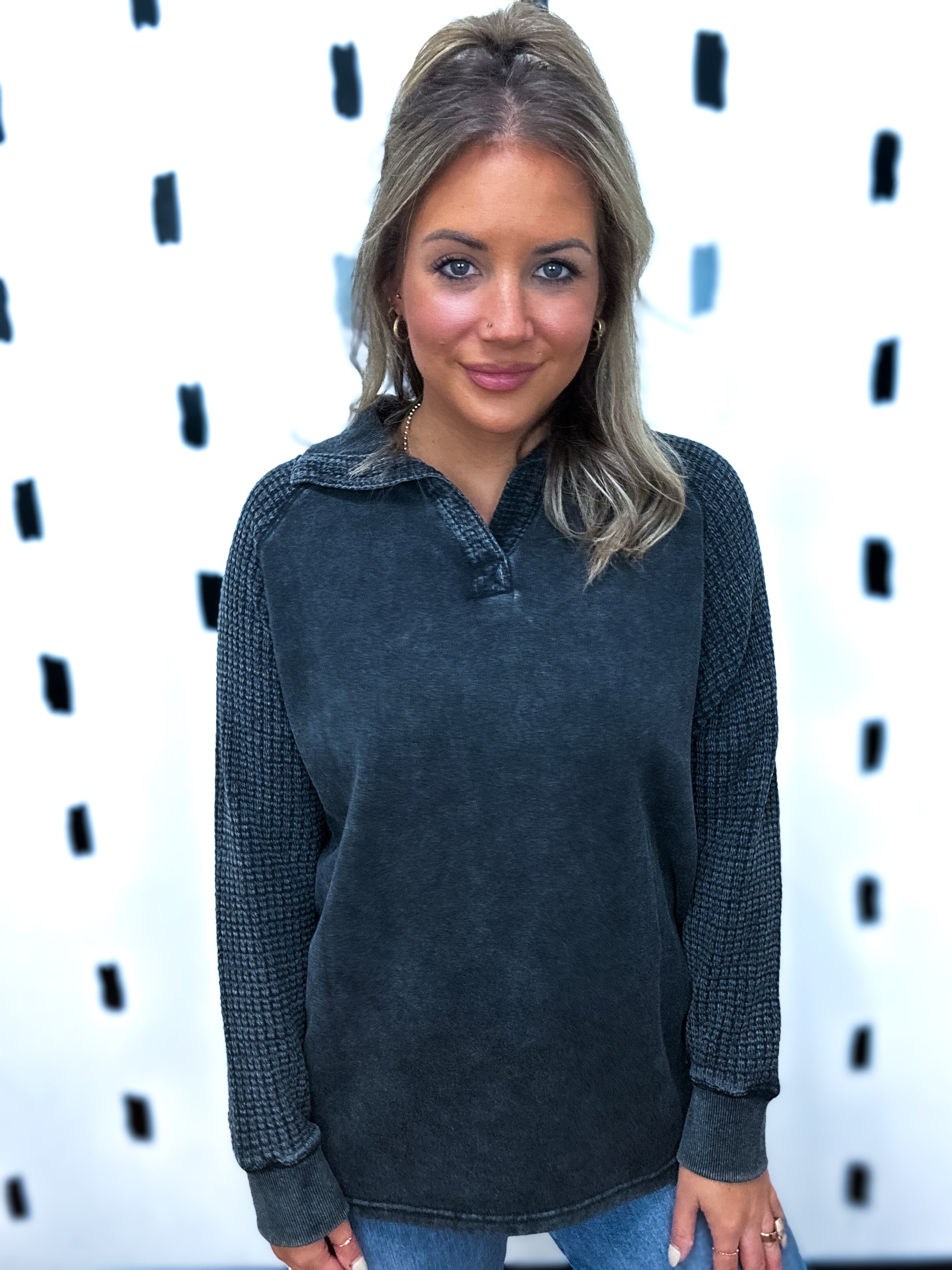 Black Waffle Knit Henley Top