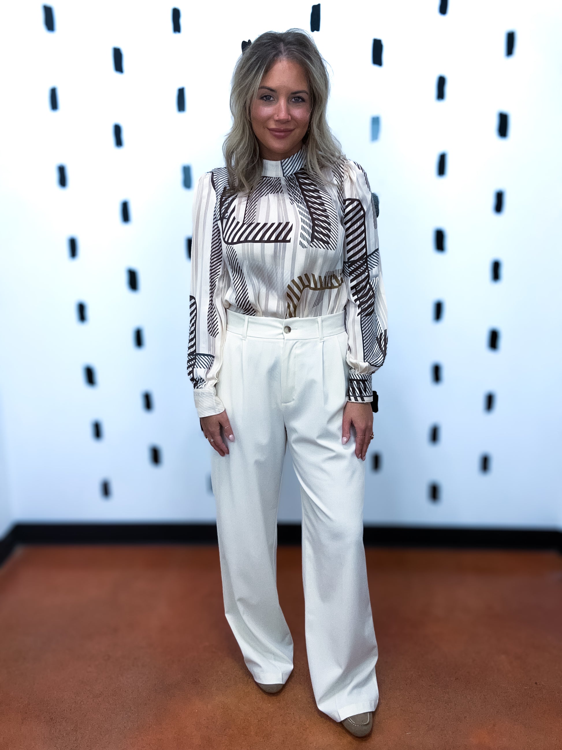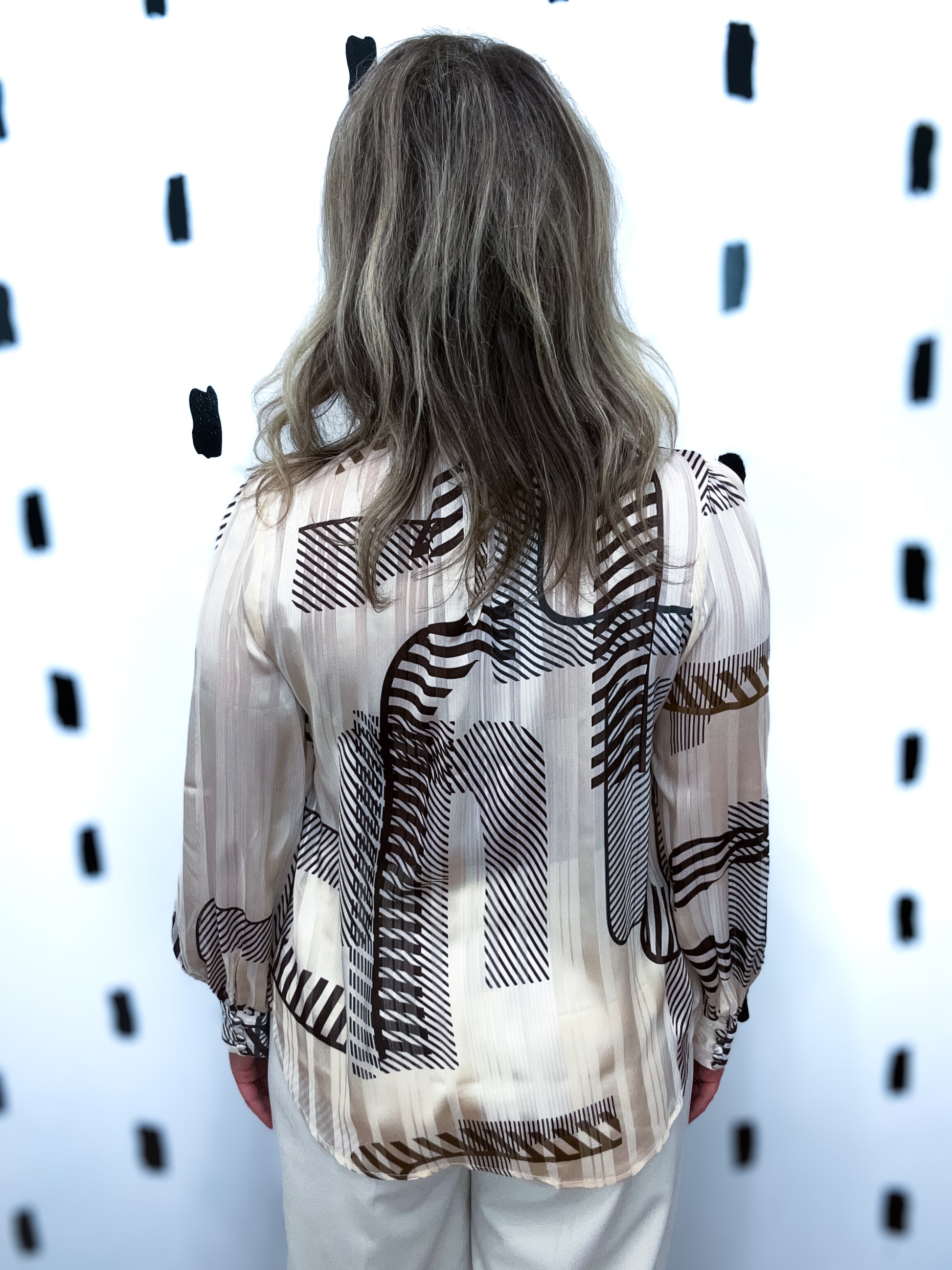 Mock neck, long sleeves, banded cuffs, back keyhole, loop buttoned cuffs, back keyhole, loop button closure, abstract print, not lined