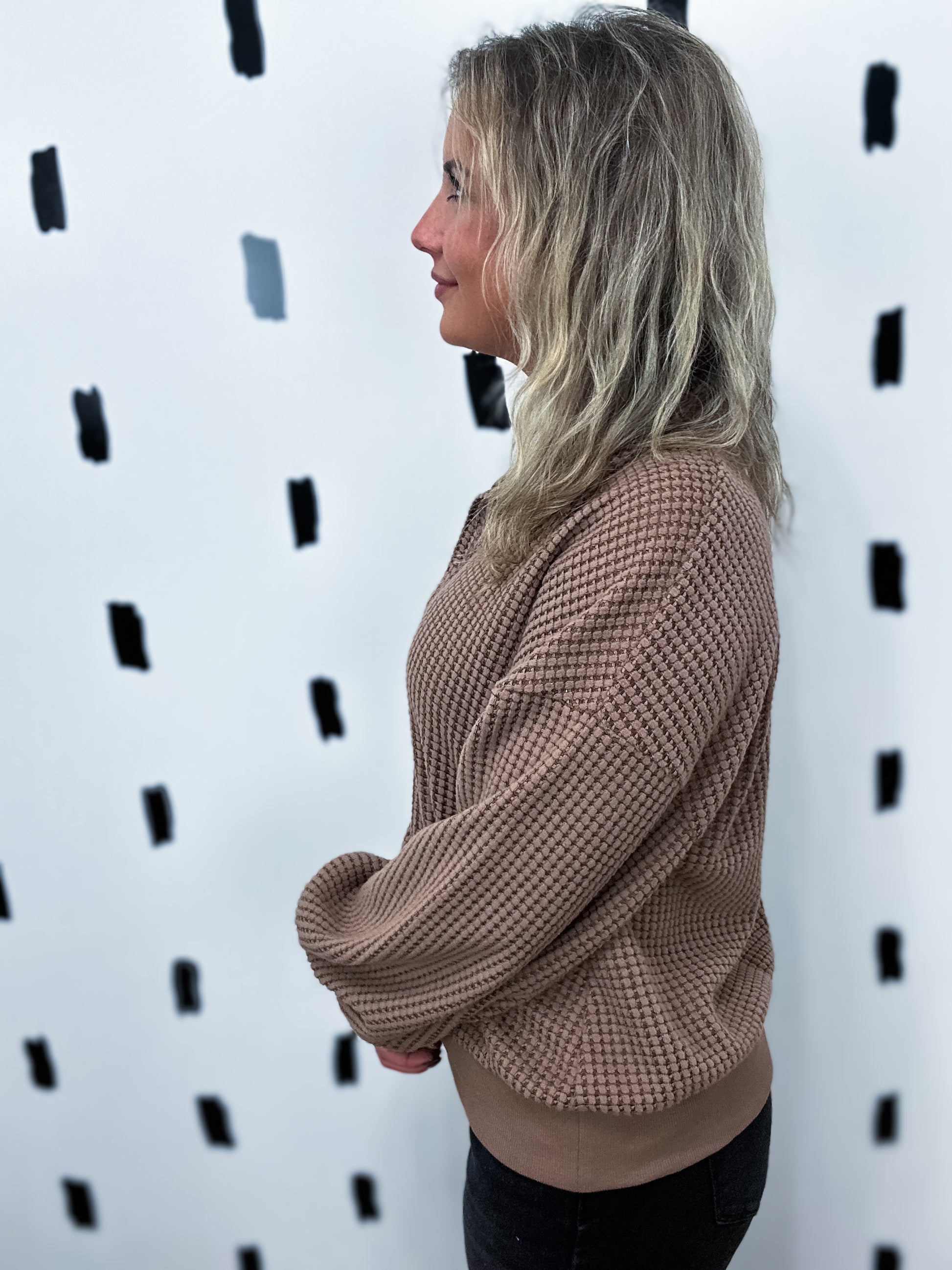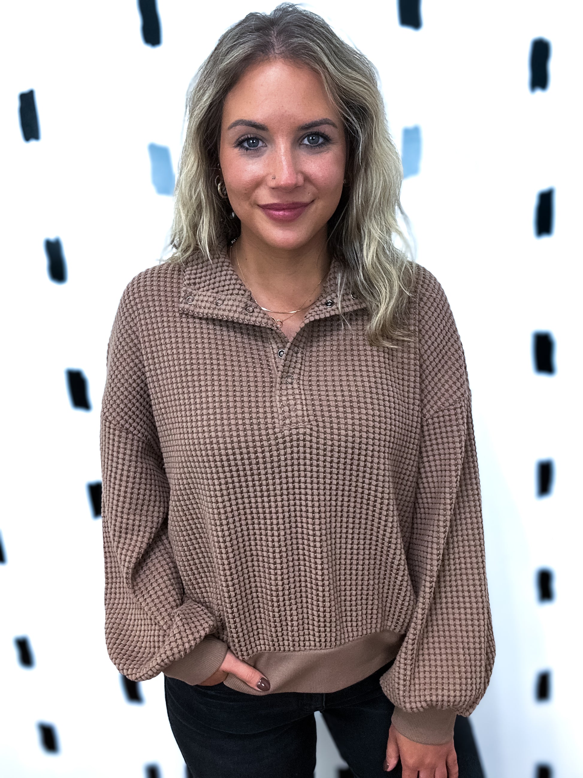 Chocolate Half Button Down Waffle Knit Top
