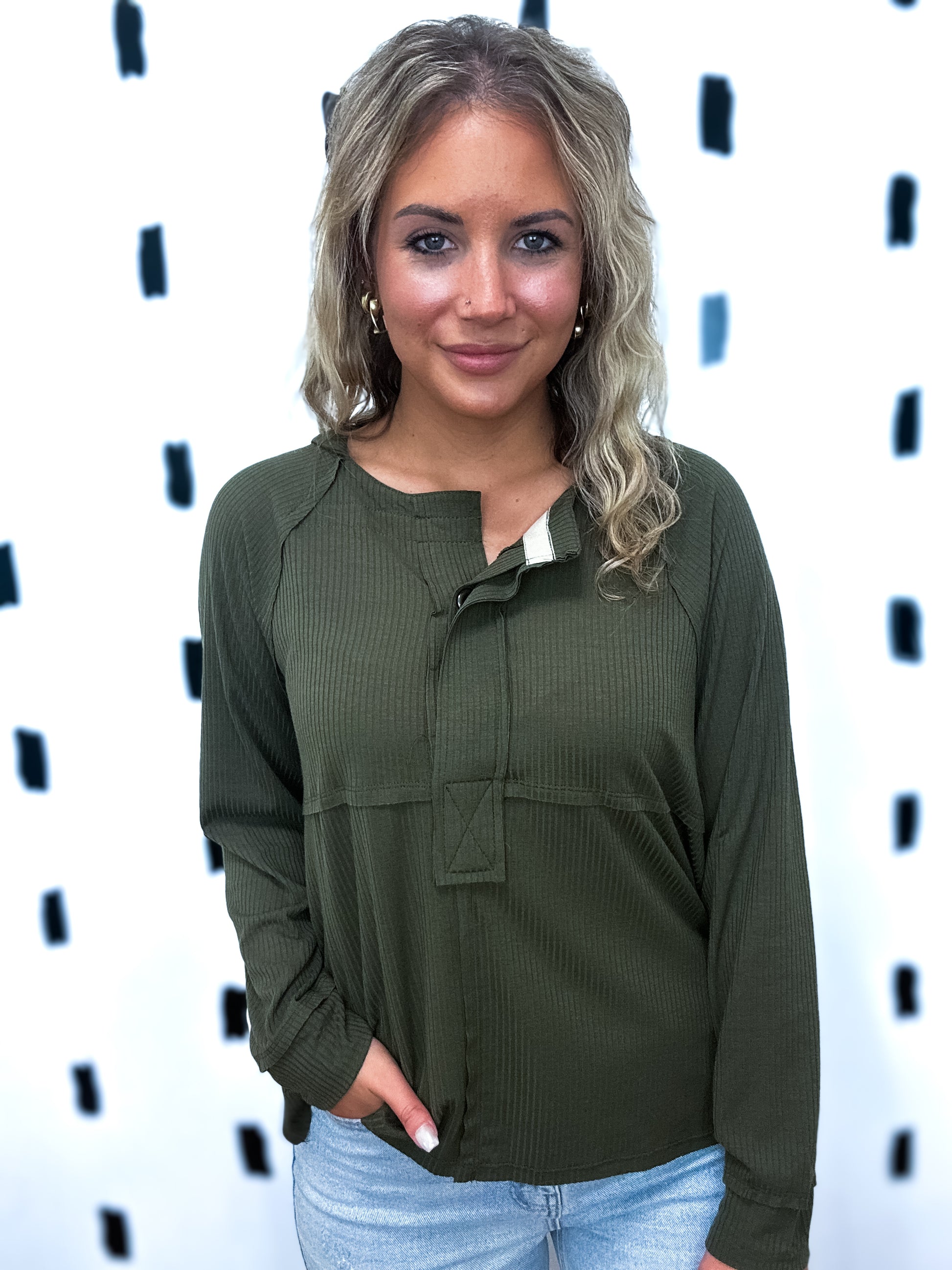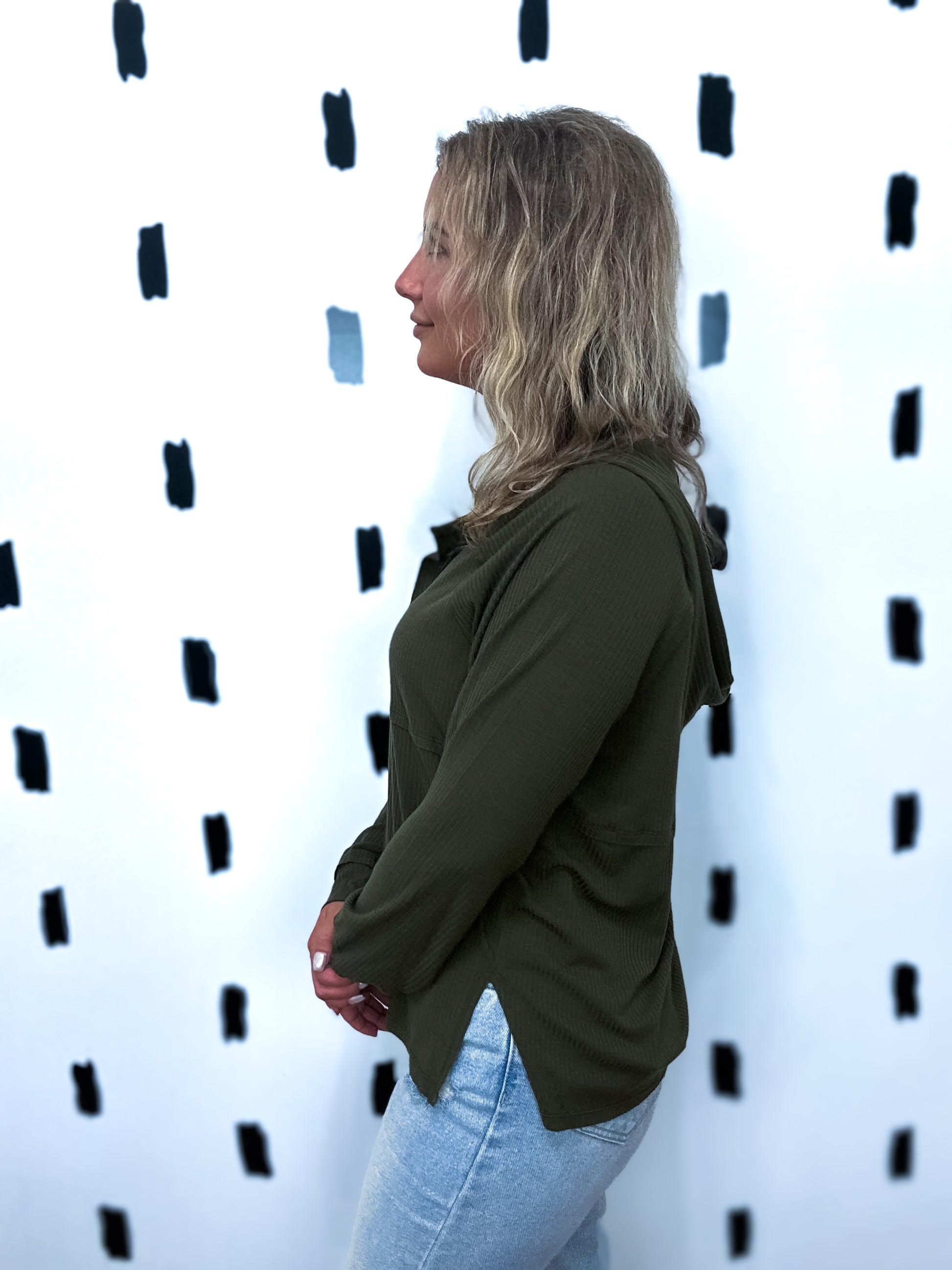 Dark Olive Ribbed Knit Hoodie Top