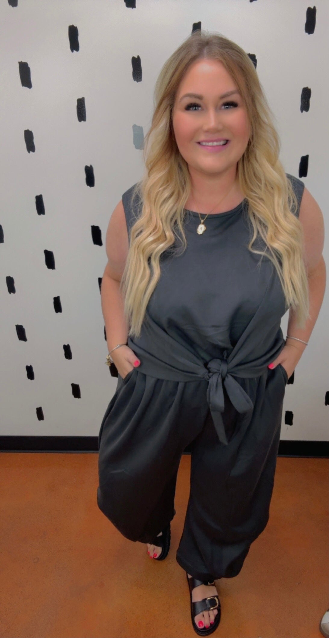 The softest most flattering two piece jumpsuit that will be a staple piece! You can throw on a denim jacket, flannel, or shacket to accent the outfit. You can also throw on a fun long sleeve mesh tee underneath as well! Andrea is wearing a size 2X in this jumpsuit.